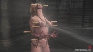 Bamboo and rope body bondage keeps this woman tied securely and her face up as they hose her down with pressure washers. Ouch!